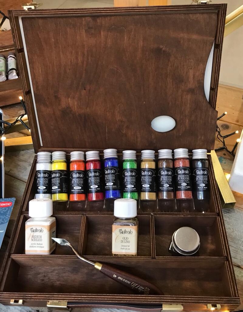 - 10 pigmenti in polvere da 30 ml: bianco di titanio, giallo limone imit., giallo arancio imit., rosso vermiglione, blu oltremare scuro, verde pappagallo, ocra gialla, ombra bruciata, terra rossa inglese, nero di marte.