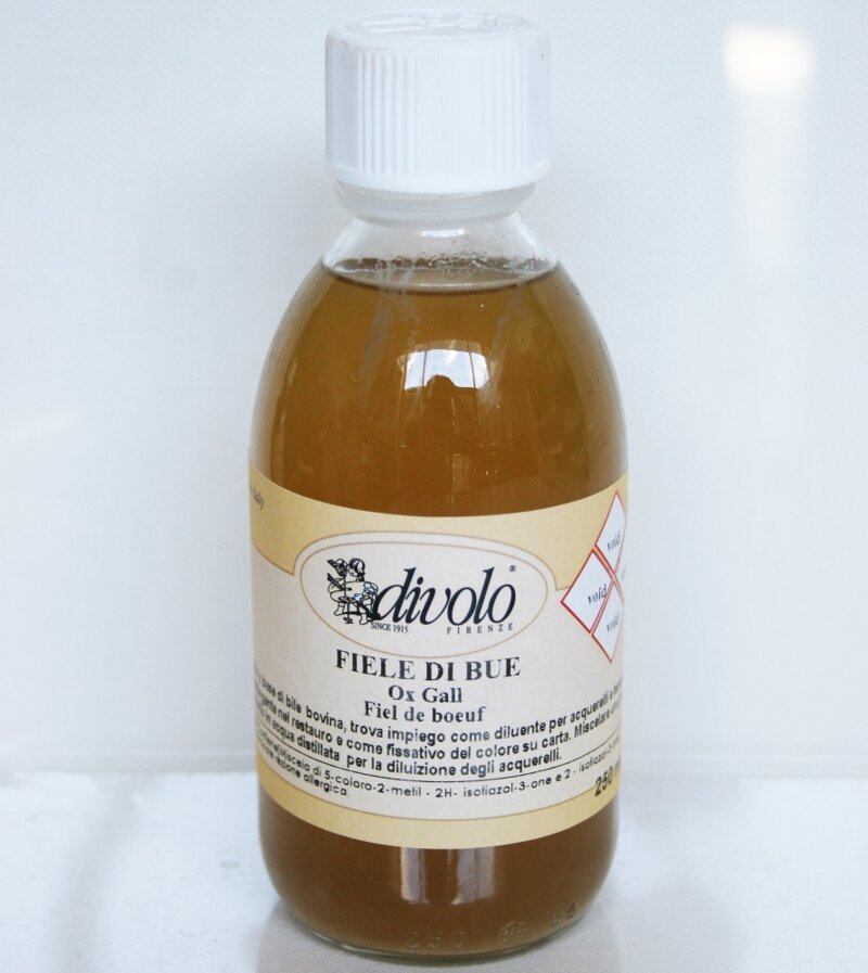 Prodotto a base di bile bovina, trova impiego come diluente per acquerelli e tempere come detergente nel restauro e come fissativo del colore su carta. Miscelare una parte del prodotto in acqua distillata per la diluizione degli acquerelli.
