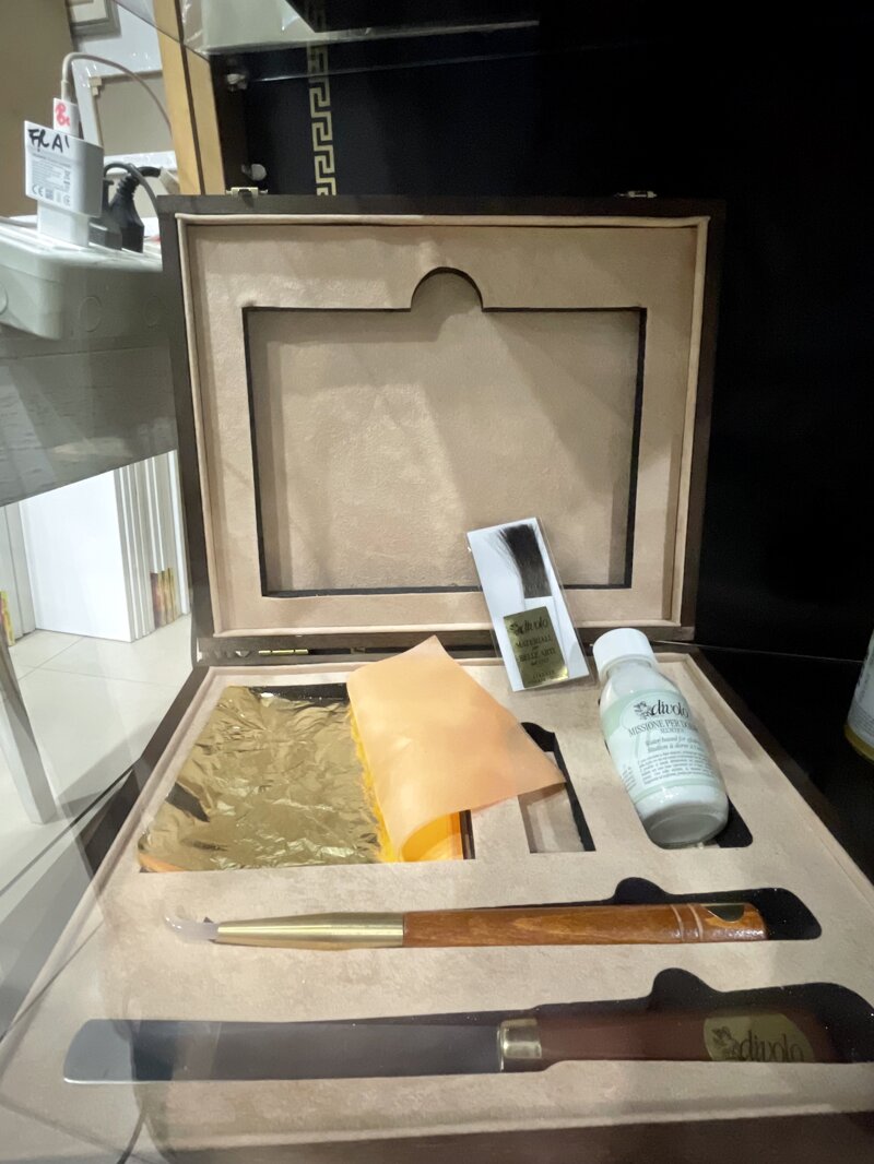 Cassetta in legno contente il kit di base per la decorazione a foglia.