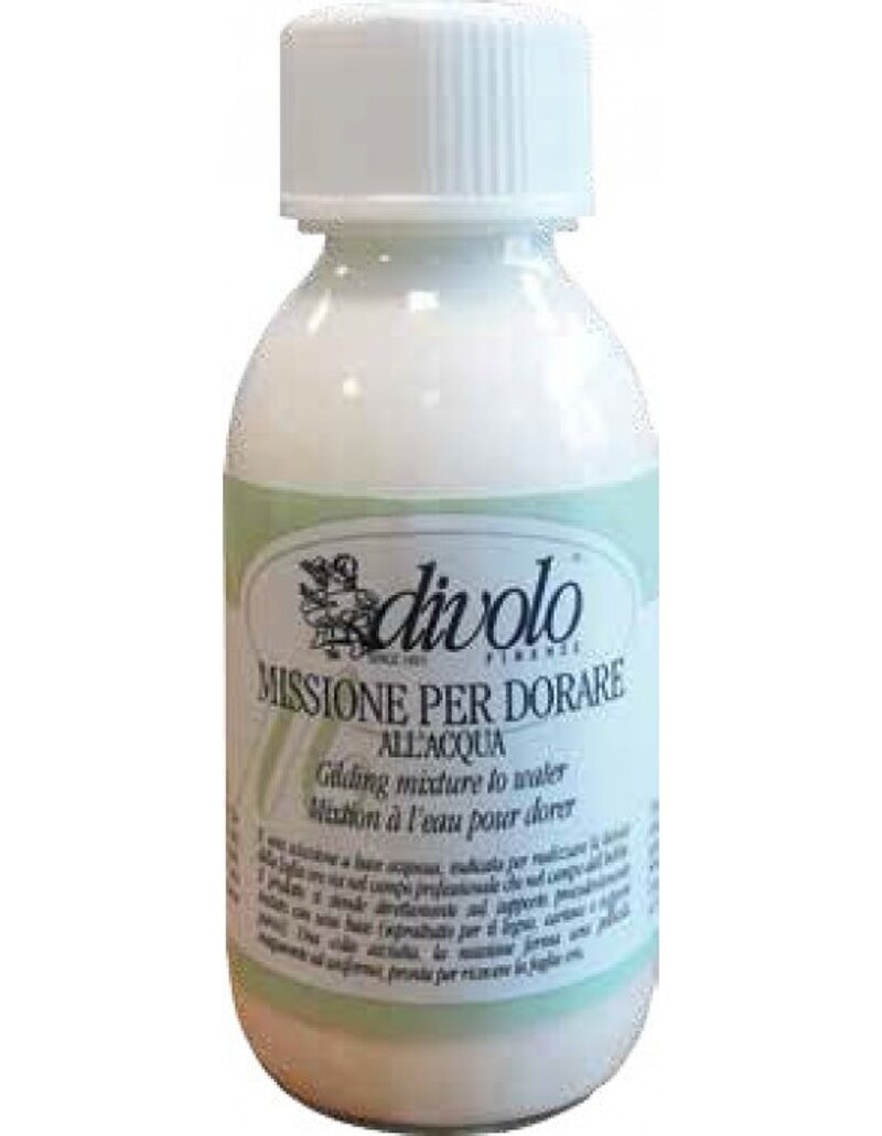 DIVOLO - Missione all'acqua per doratura da 125 mlSoluzione a base acquosa indicata per realizzare la tecnica della foglia oro sia nel campo professionale che nel campo dell'hobby. Il prodotto si stende direttamente sul supporto precedentemente trattato con una base. Una volta asciutta forma una pellicola trasparente ed uniforme, pronta per ricevere la foglia.