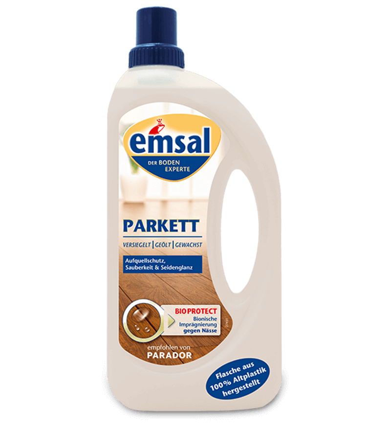 EMSAL - PARKETT - Detergente per pavimenti in legnoCura a lunga durata per il parquet sigillato. La formula di protezione dall'umidità Biotprotect offre un'efficace protezione contro il gonfiore. L'impermeabilizzante garantisce profondità e lucentezza opaca.
